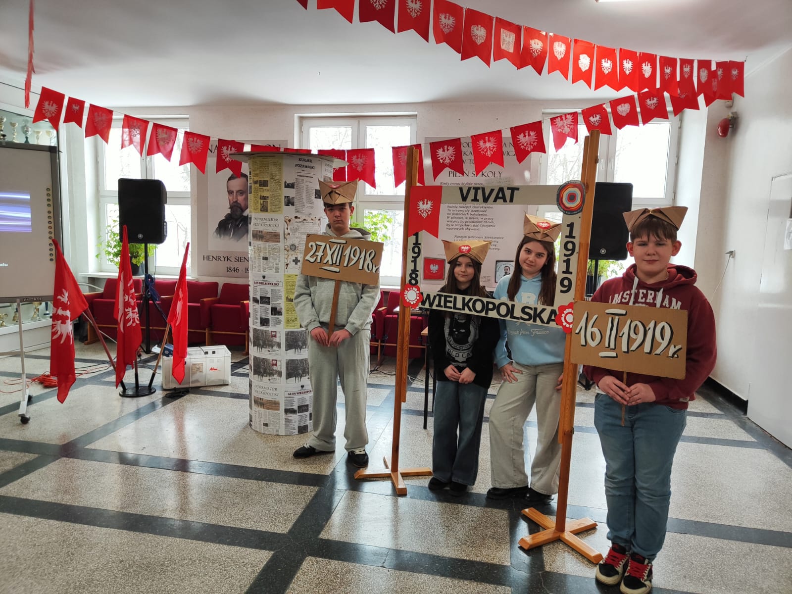 Nie zabrakło także wspólnego śpiewania pieśni patriotycznych, w tym „Marsylianki wielkopolskiej”. Zwieńczeniem obchodów było wspólne zdjęcie w rogatywkach, które uczniowie wykonali samodzielnie podczas lekcji historii.