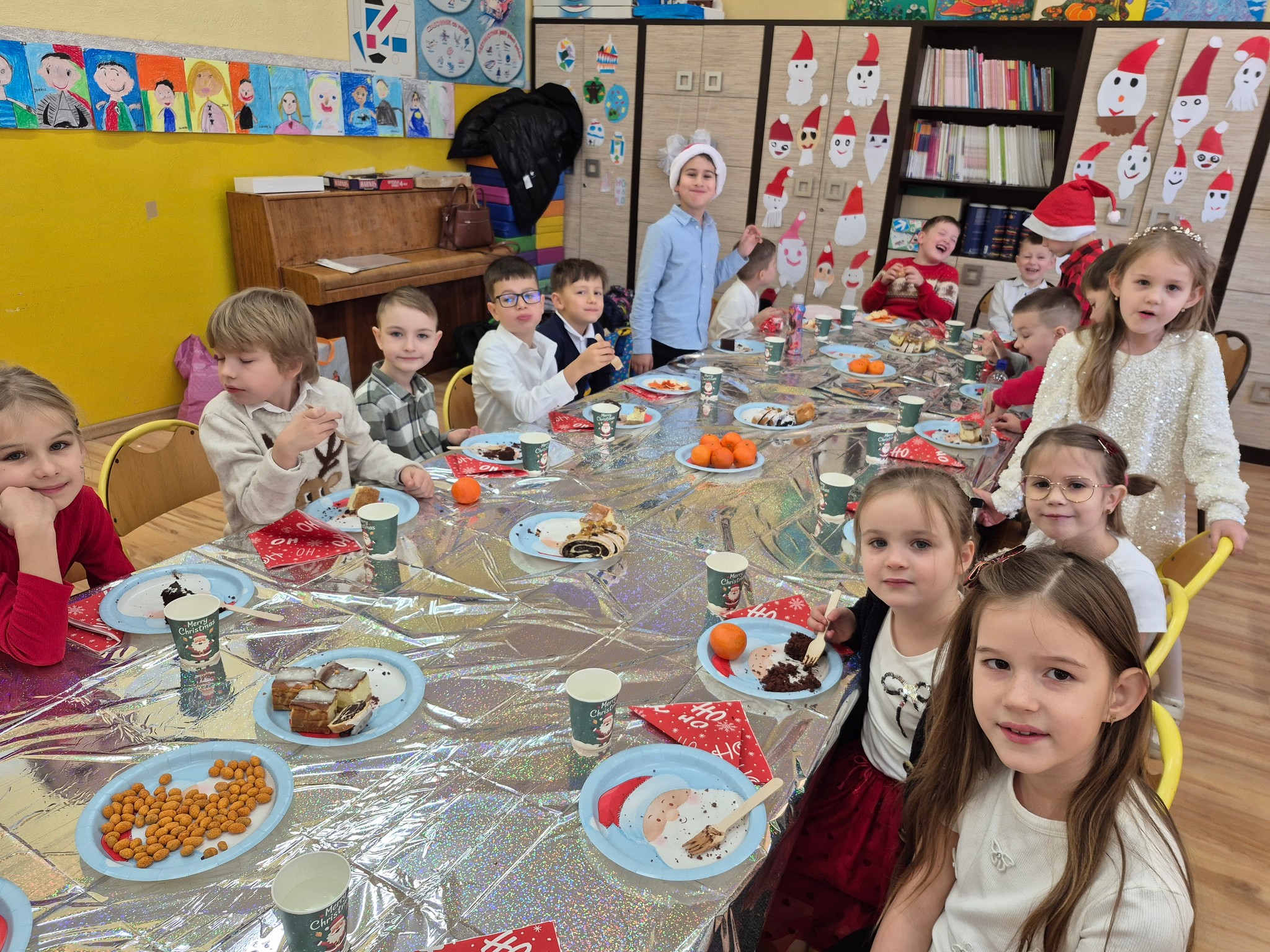 W piątek 19 grudnia dzieci z klasy 1c uczestniczyły w jasełkach przygotowanych przez starszych uczniów z naszej szkoły. Po nastrojowych występach w hali gimnastycznej, uczniowie wrócili do sali lekcyjnej, gdzie zastali pięknie nakryte stoły, a na nich smaczne pierogi z kapustą i grzybami oraz świąteczne ciasta i owoce. Po poczęstunku dzieci wspólnie śpiewały kolędy i pastorałki oraz tańczyły mikołajkowe tańce według układów choreograficznych, wyświetlanych na nowym monitorze interaktywnym – prezencie dla klasy od Świętego Mikołaja. Taniec, wspólne kolędowanie i przyjazna atmosfera sprawiły, że na twarzach dzieci widniał uśmiech, a dzień spędzony w szkole był przyjemną formą integracji.
