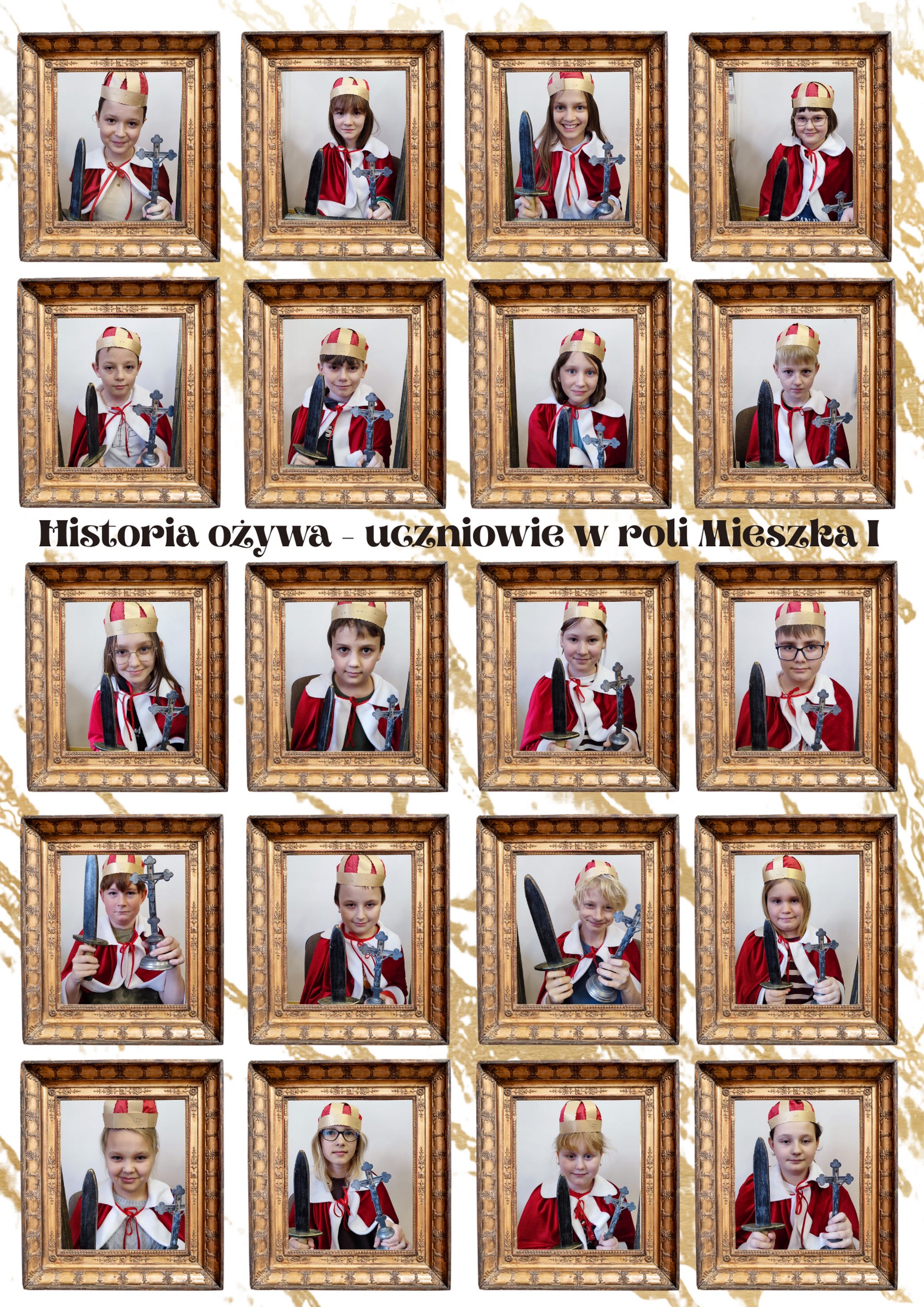 Lekcja nie ograniczała się jedynie do teorii i dat. Uczniowie mieli okazję spojrzeć na historię z zupełnie innej perspektywy, wcielając się w rolę księcia Mieszka. Za pomocą prostych rekwizytów i elementów stroju tworzyli stylizacje inspirowane średniowiecznym władcą, a następnie pozowali do pamiątkowych fotografii.