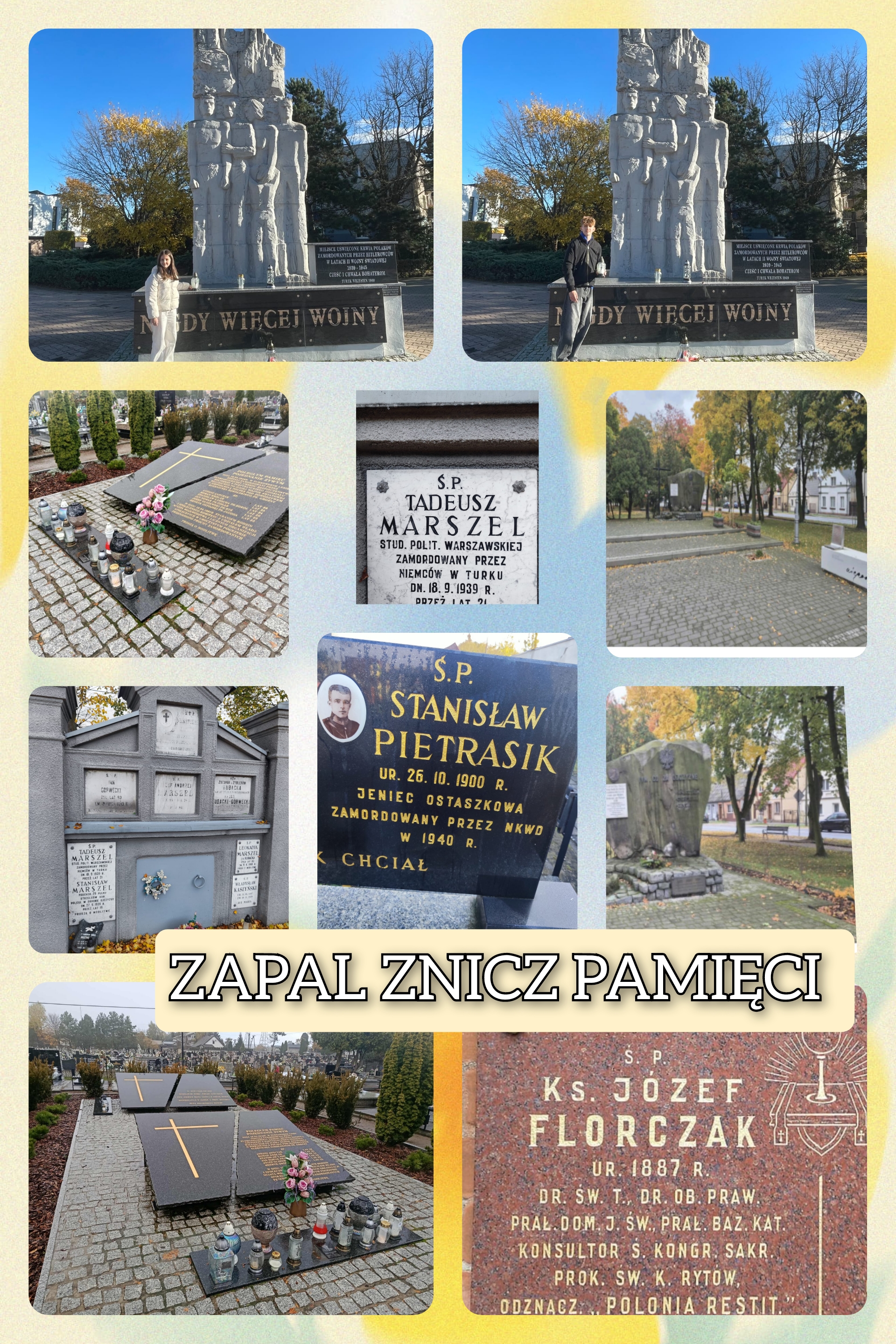 Jak co roku, w październiku nasza szkoła włącza się w akcję „Zapal Znicz Pamięci” dla przypomnienia ofiar niemieckich zbrodni dokonanych w ramach „politycznego oczyszczania gruntu” w 1939 r. Uczniowie wyposażeni w aparaty fotograficzne ruszyli w teren, by upamiętnić okoliczne groby z poległymi na początku II wojny światowej.