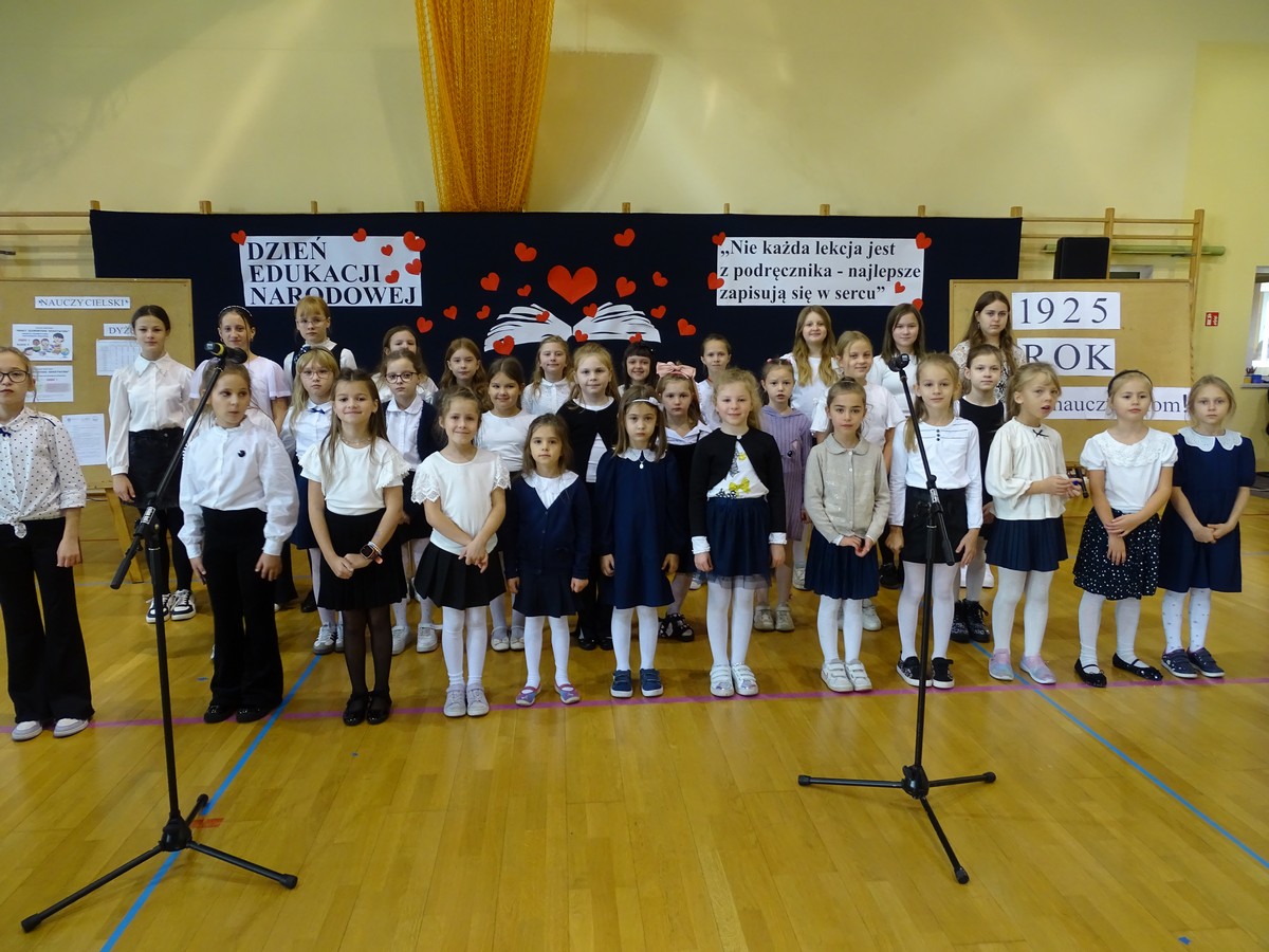 13 października w naszej szkole odbył się uroczysty apel z okazji Dnia Edukacji Narodowej. Uczniowie klas 2b i 2c przygotowali specjalny program artystyczny, w którym w zabawny i refleksyjny sposób uczcili święto wszystkich nauczycieli oraz pracowników administracji i obsługi. Pierwsza scenka przeniosła widzów do pokoju nauczycielskiego, gdzie w humorystyczny sposób przedstawiono codzienne życie nauczycieli – ich rozmowy, troski i radości. Publiczność z uśmiechem obserwowała tę pełną ciepła i żartów inscenizację. Druga część apelu była bardziej refleksyjna – uczniowie za pomocą wehikułu czasu cofnęli się o 100 lat, do roku 1925.Scenka ta przypomniała wszystkim, że mimo upływu lat, wartości takie jak szacunek, wiedza, praca i wdzięczność wobec nauczycieli pozostają niezmienne. Program artystyczny uświetniły również piosenki, taniec oraz serdeczne życzenia dla nauczycieli, którym dzieci dziękowały za trud, cierpliwość i codzienną pracę. Apel był pięknym wyrazem wdzięczności i uznania dla wszystkich pedagogów i wszystkich pracowników szkoły – pełen wzruszeń, uśmiechu i radości.